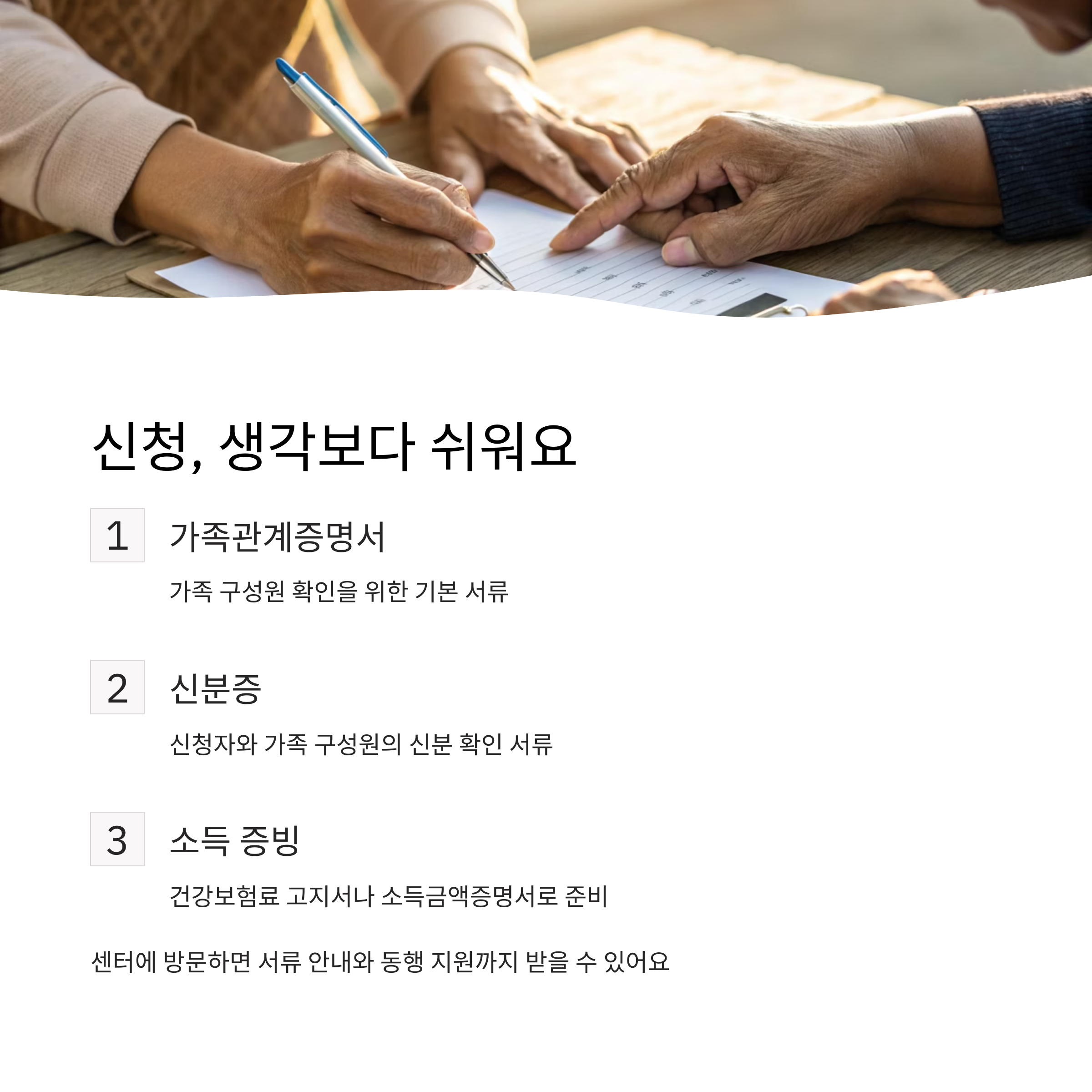 센터에 방문하면 서류 안내와 동행 지원까지 받으실 수 있어요.